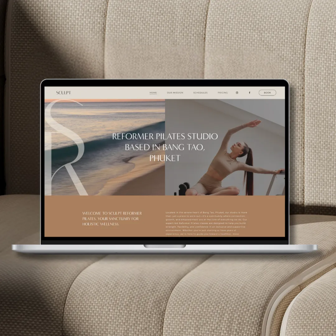 Sculpt Reformer Pilates approached Studio Jac & Co ahead of their studio opening in Phuket, Thailand. While the business had a foundational identity ready to go, it lacked the polish and refinement needed to reflect their luxurious, wellness-driven offering. They needed a digital presence and brand experience that felt high-end, serene, and completely aligned with their studio’s modern aesthetic.